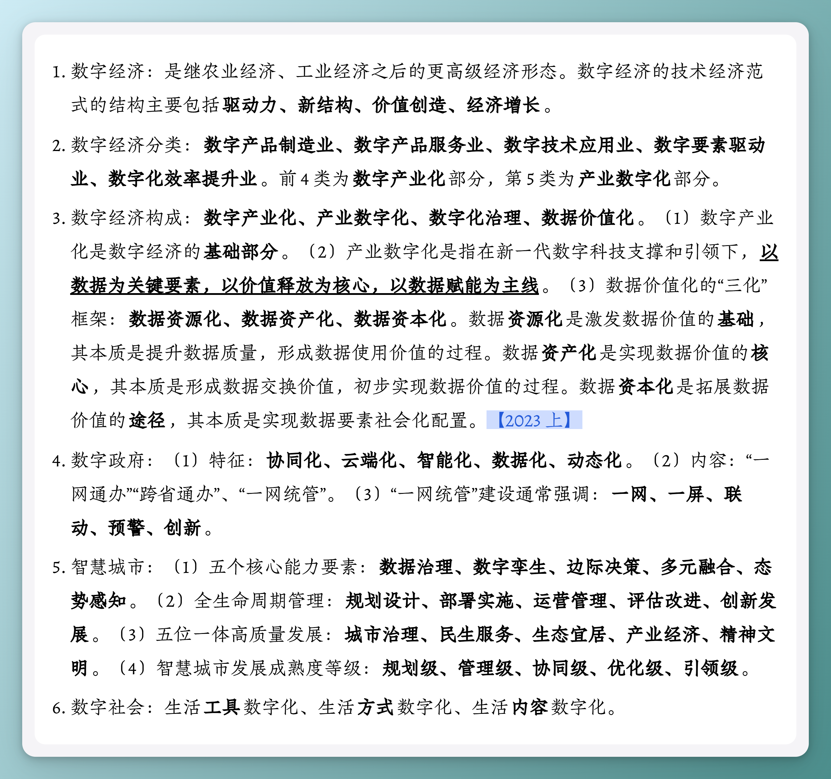 - 数字政府:(1)特征:协同化、云端化、智能化、数据化、动态化。(2)内容:“一网通办”“跨省通办”、“一网统管”。(3)“一网统管”建设通常强调:一网、一屏、联动、预警、创新。