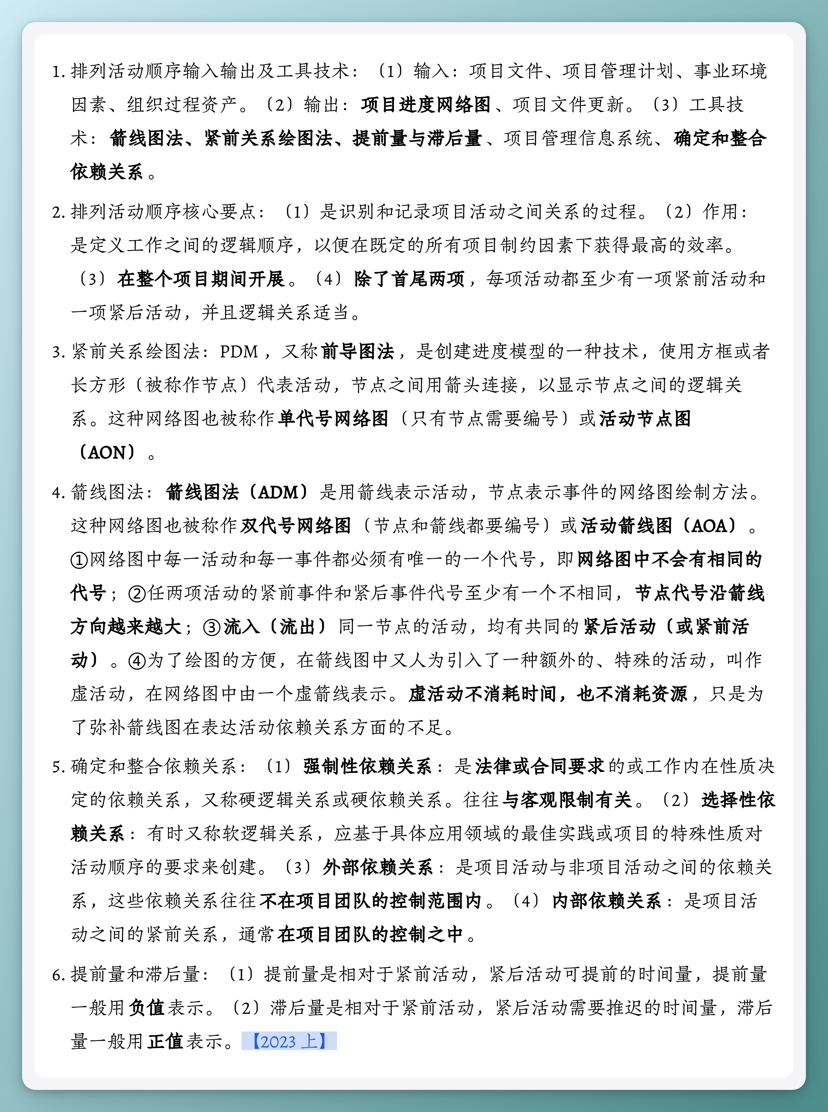 - 排列活动顺序输入输出及工具技术:(1)输入:项目文件、项目管理计划、事业环境因素、组织过程资产。(2)输出:项目进度网络图、项目文件更新。(3)工具技术:箭线图法、紧前关系绘图法、提前量与滞后量、项目管理信息系统、确定和整合依赖关系。