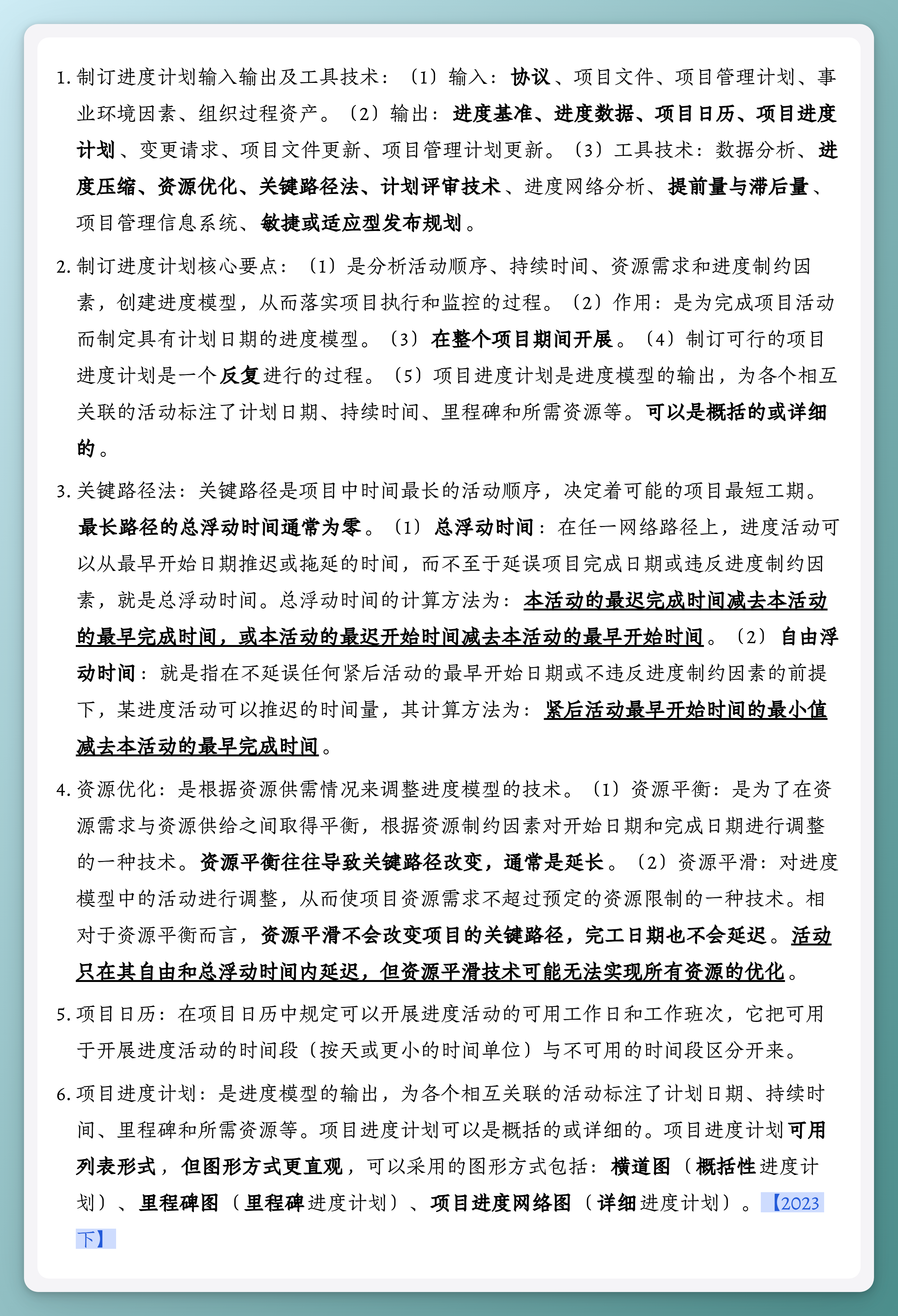 - 制订进度计划输入输出及工具技术:(1)输入:协议、项目文件、项目管理计划、事业环境因素、组织过程资产。(2)输出:进度基准、进度数据、项目日历、项目进度计划、变更请求、项目文件更新、项目管理计划更新。(3)工具技术:数据分析、进度压缩、资源优化、关键路径法、计划评审技术、进度网络分析、提前量与滞后量、项目管理信息系统、敏捷或适应型发布规划。