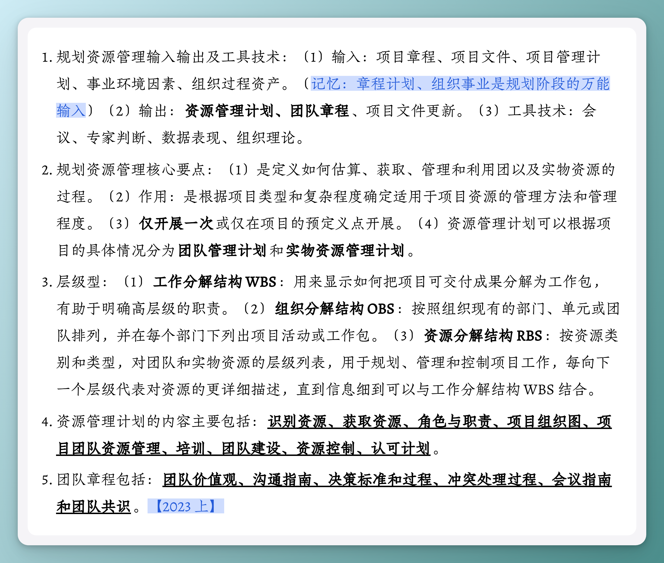 - 规划资源管理输入输出及工具技术:(1)输入:项目章程、项目文件、项目管理计划、事业环境因素、组织过程资产。(记忆:章程计划、组织事业是规划阶段的万能输入)(2)输出:资源管理计划、团队章程、项目文件更新。(3)工具技术:会议、专家判断、数据表现、组织理论。
