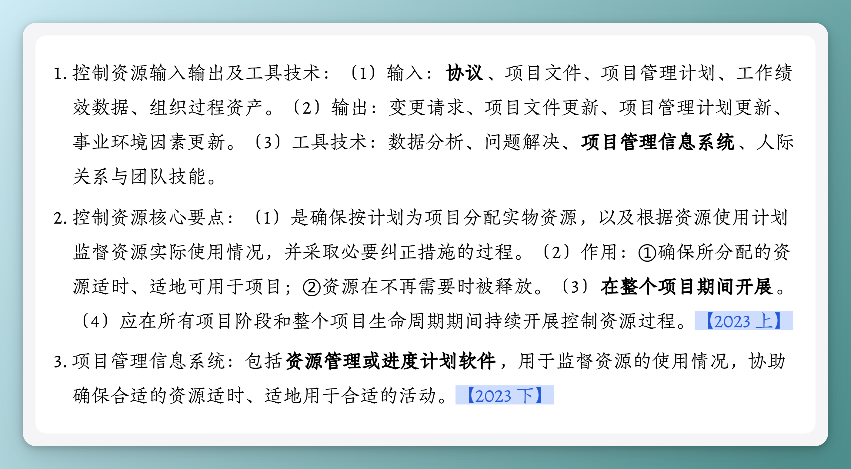 2. 控制资源核心要点:(1)是确保按计划为项目分配实物资源,以及根据资源使用计划监督资源实际使用情况,并采取必要纠正措施的过程。(2)作用:①确保所分配的资源适时、适地可用于项目;②资源在不再需要时被释放。(3)在整个项目期间开展。(4)应在所有项目阶段和整个项目生命周期期间持续开展控制资源过程。【2023 上】
