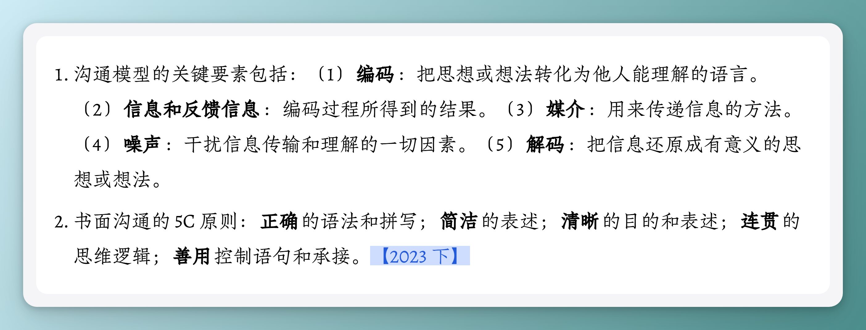 2. 书面沟通的 5C 原则:正确的语法和拼写;简洁的表述;清晰的目的和表述;连贯的思维逻辑;善用控制语句和承接。【2023 下】