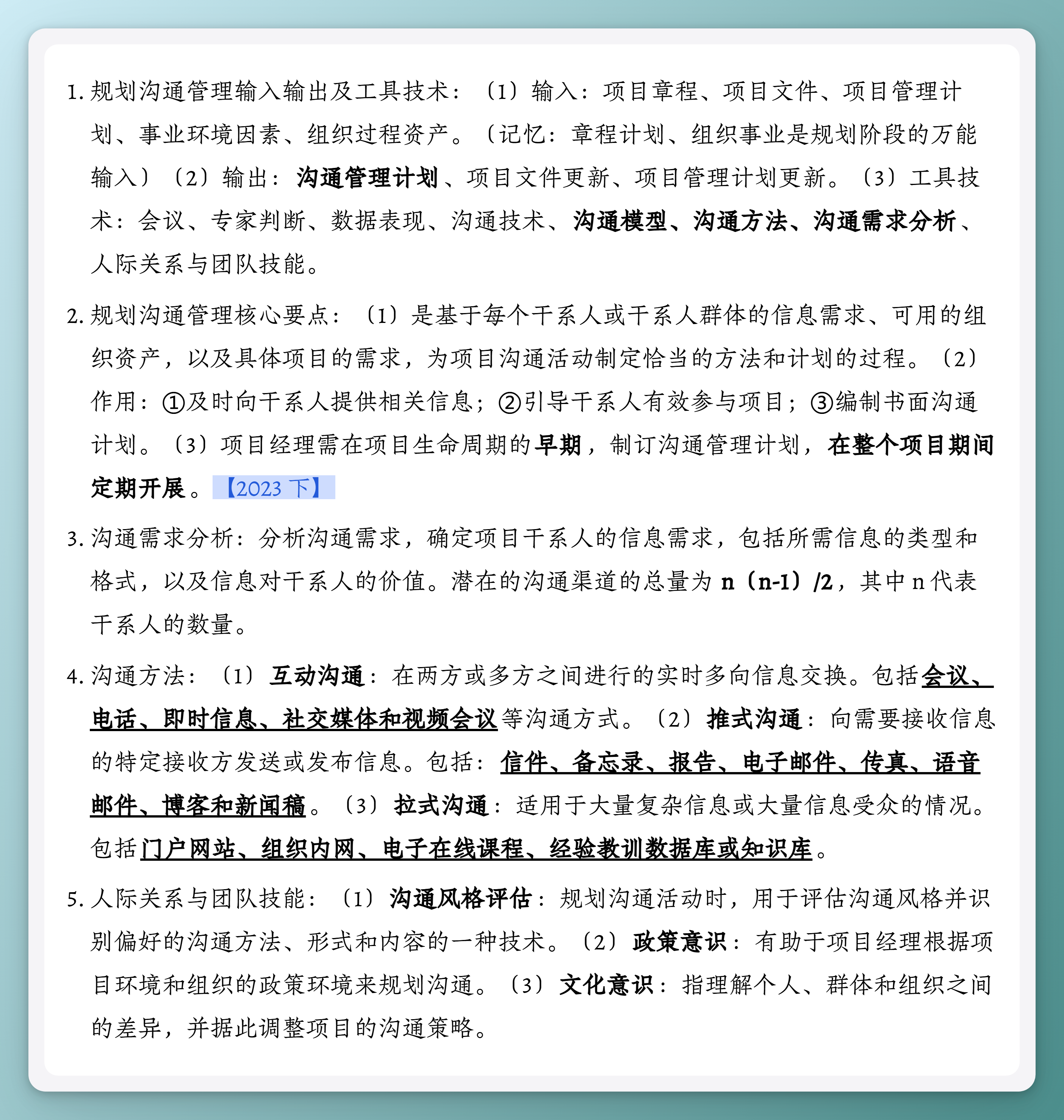 2. 规划沟通管理核心要点:(1)是基于每个干系人或干系人群体的信息需求、可用的组织资产,以及具体项目的需求,为项目沟通活动制定恰当的方法和计划的过程。(2)作用:①及时向干系人提供相关信息;②引导干系人有效参与项目;③编制书面沟通计划。(3)项目经理需在项目生命周期的早期,制订沟通管理计划,在整个项目期间定期开展。【2023 下】
