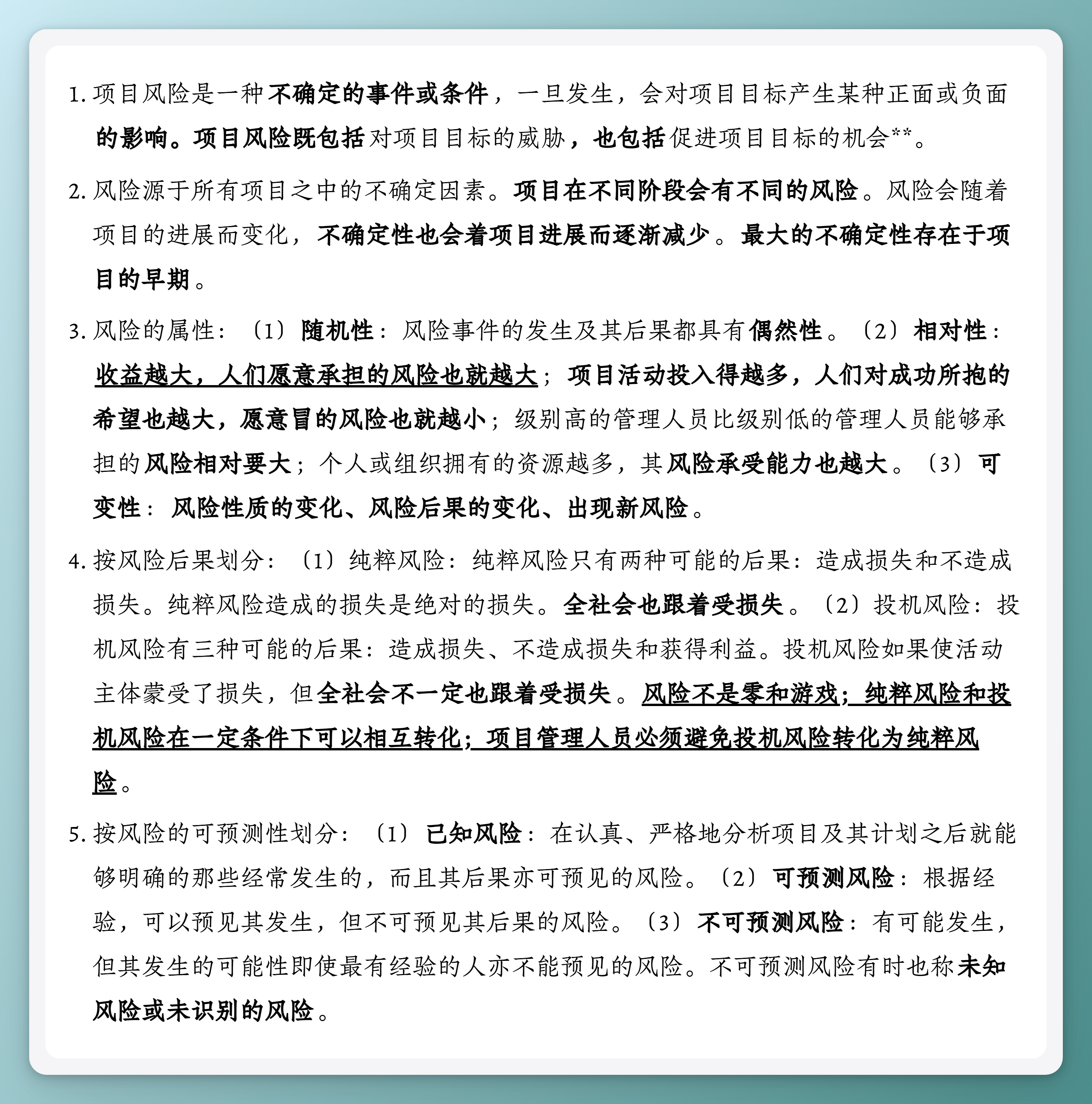 - 项目风险是一种不确定的事件或条件,一旦发生,会对项目目标产生某种正面或负面的影响。项目风险既包括对项目目标的威胁**,也包括促进项目目标的机会。