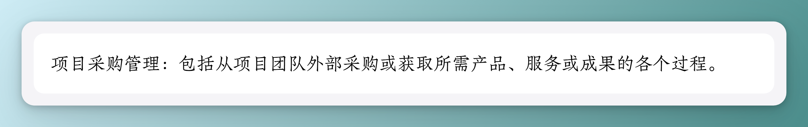 项目采购管理:包括从项目团队外部采购或获取所需产品、服务或成果的各个过程。