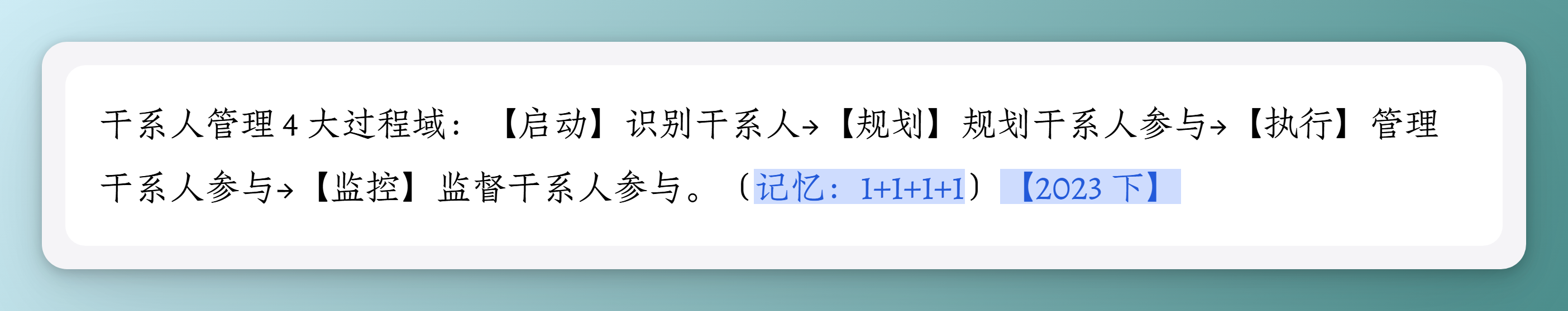 干系人管理 4 大过程域:【启动】识别干系人→【规划】规划干系人参与→【执行】管理干系人参与→【监控】监督干系人参与。(记忆:1+1+1+1)【2023 下】