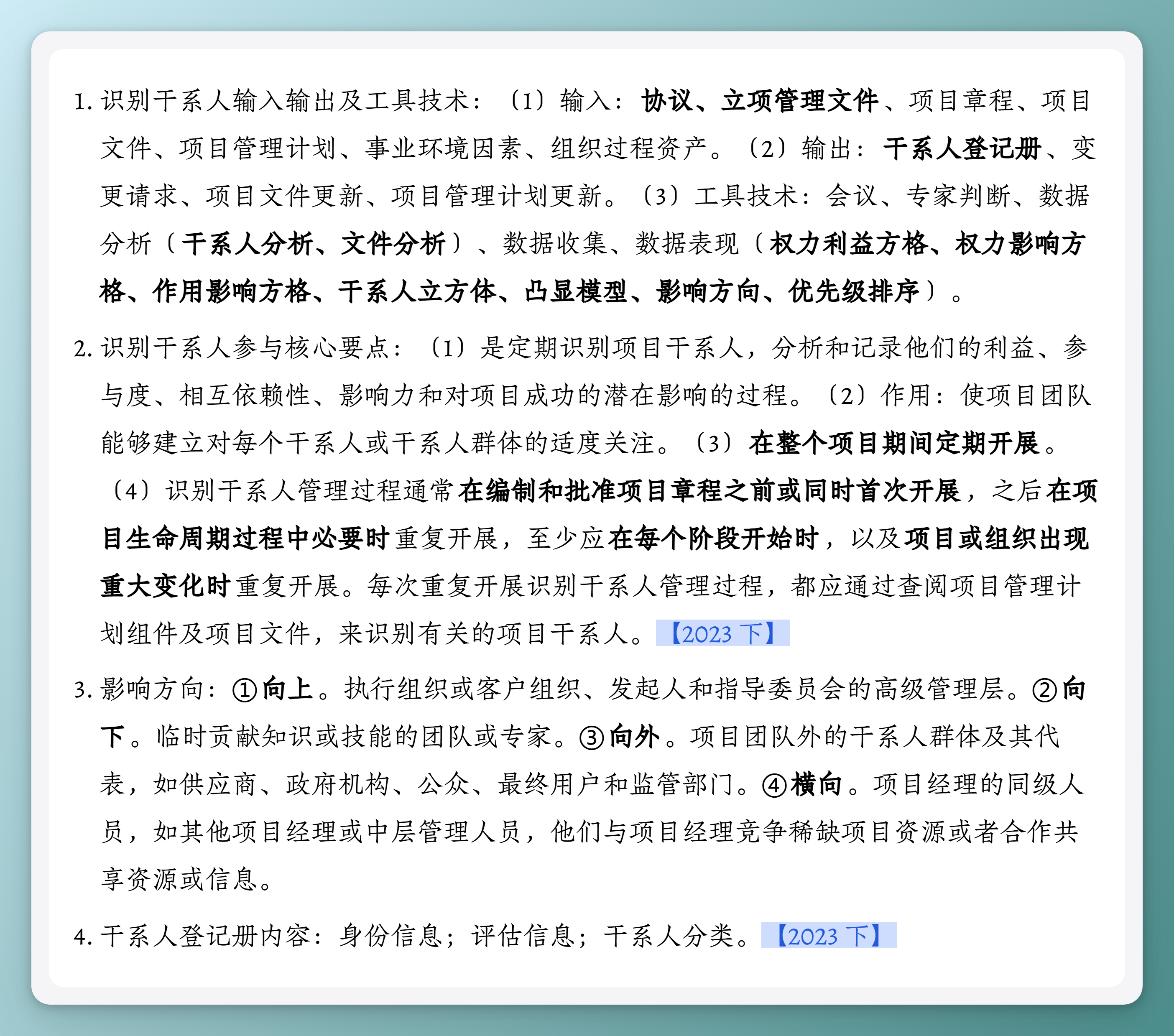 - 识别干系人参与核心要点:(1)是定期识别项目干系人,分析和记录他们的利益、参与度、相互依赖性、影响力和对项目成功的潜在影响的过程。(2)作用:使项目团队能够建立对每个干系人或干系人群体的适度关注。(3)在整个项目期间定期开展。(4)识别干系人管理过程通常在编制和批准项目章程之前或同时首次开展,之后在项目生命周期过程中必要时重复开展,至少应在每个阶段开始时,以及项目或组织出现重大变化时重复开展。每次重复开展识别干系人管理过程,都应通过查阅项目管理计划组件及项目文件,来识别有关的项目干系人。【2023 下】