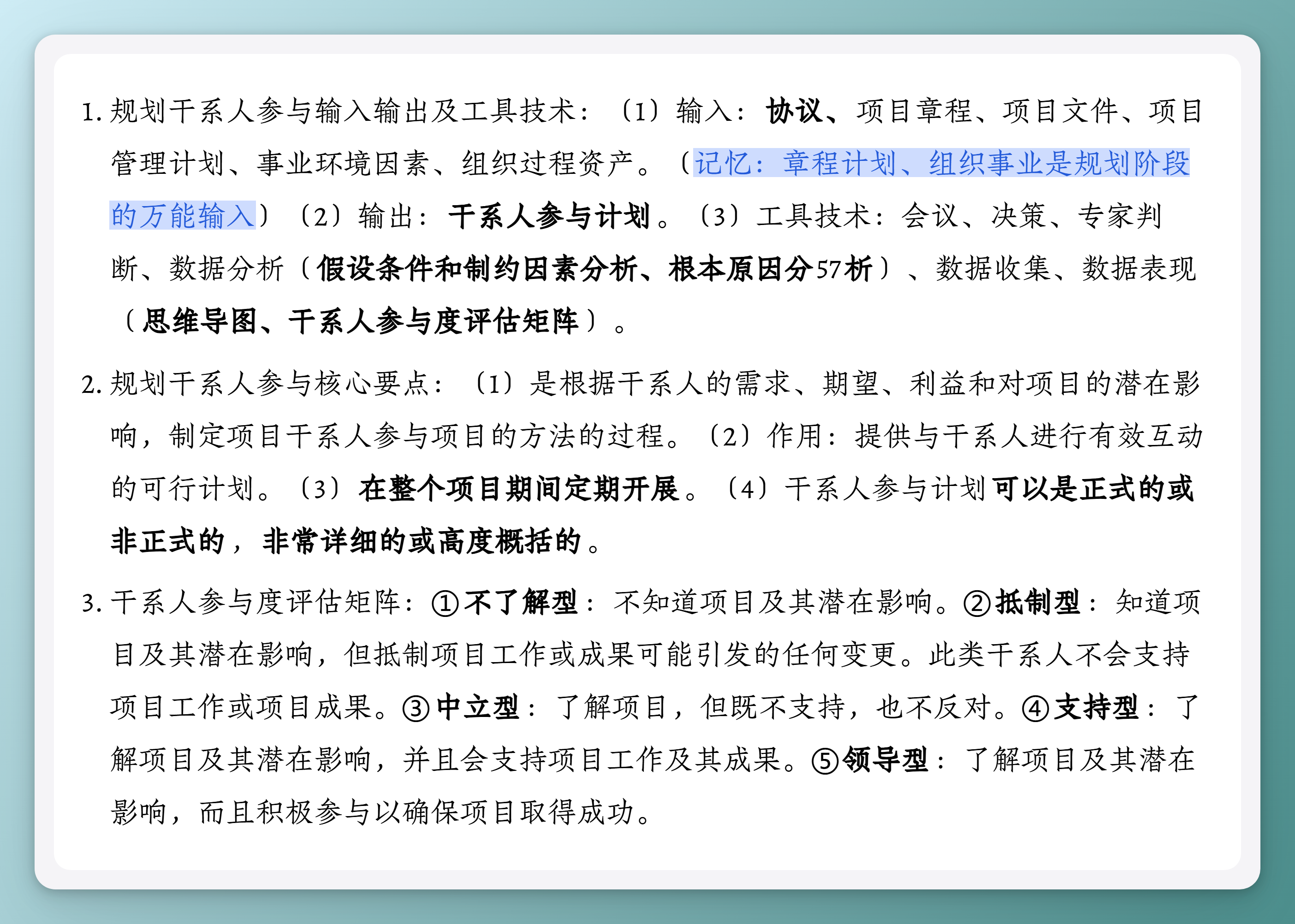 - 规划干系人参与输入输出及工具技术:(1)输入:协议、项目章程、项目文件、项目管理计划、事业环境因素、组织过程资产。(记忆:章程计划、组织事业是规划阶段的万能输入)(2)输出:干系人参与计划。(3)工具技术:会议、决策、专家判断、数据分析(假设条件和制约因素分析、根本原因分57析)、数据收集、数据表现(思维导图、干系人参与度评估矩阵)。
