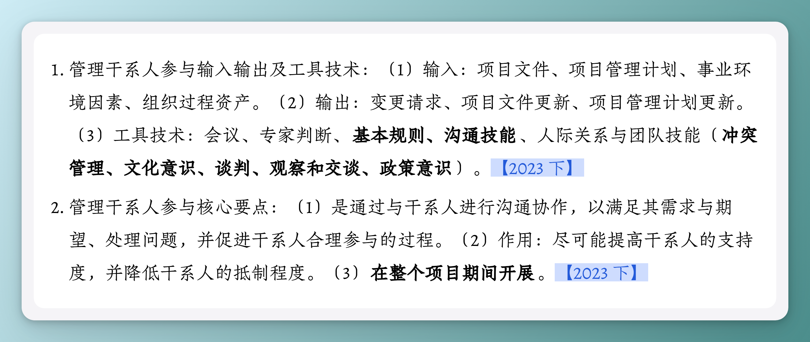 1. 管理干系人参与输入输出及工具技术:(1)输入:项目文件、项目管理计划、事业环境因素、组织过程资产。(2)输出:变更请求、项目文件更新、项目管理计划更新。(3)工具技术:会议、专家判断、基本规则、沟通技能、人际关系与团队技能(冲突管理、文化意识、谈判、观察和交谈、政策意识)。【2023 下】