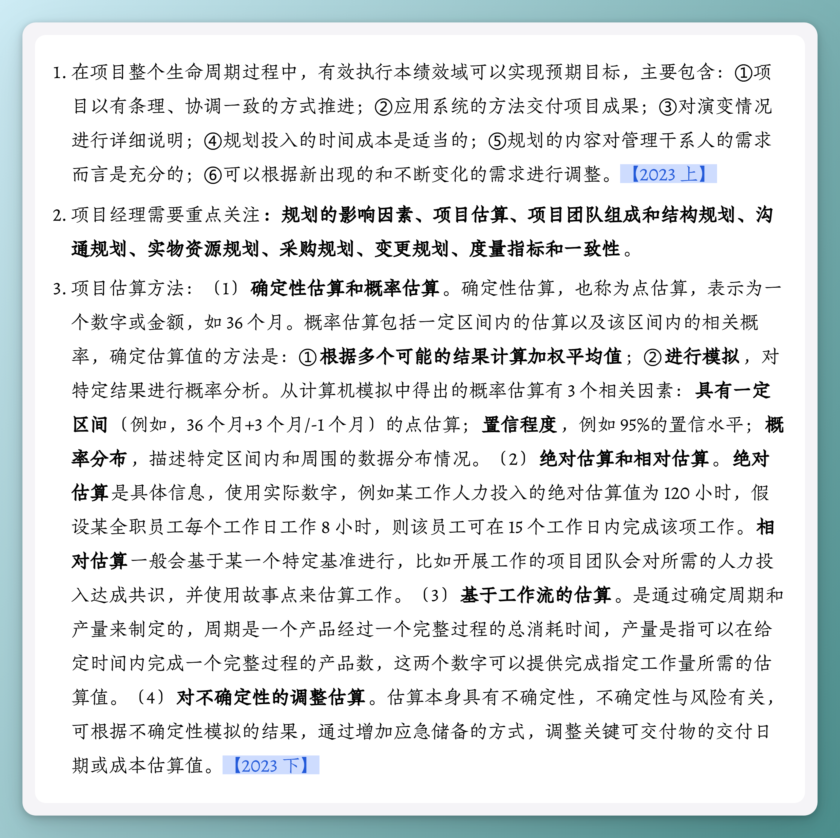 - 项目估算方法:(1)确定性估算和概率估算。确定性估算,也称为点估算,表示为一个数字或金额,如 36 个月。概率估算包括一定区间内的估算以及该区间内的相关概率,确定估算值的方法是:①根据多个可能的结果计算加权平均值;②进行模拟,对特定结果进行概率分析。从计算机模拟中得出的概率估算有 3 个相关因素:具有一定区间(例如,36 个月+3 个月/-1 个月)的点估算;置信程度,例如 95%的置信水平;概率分布,描述特定区间内和周围的数据分布情况。(2)绝对估算和相对估算。绝对估算是具体信息,使用实际数字,例如某工作人力投入的绝对估算值为 120 小时,假设某全职员工每个工作日工作 8 小时,则该员工可在 15 个工作日内完成该项工作。相对估算一般会基于某一个特定基准进行,比如开展工作的项目团队会对所需的人力投入达成共识,并使用故事点来估算工作。(3)基于工作流的估算。是通过确定周期和产量来制定的,周期是一个产品经过一个完整过程的总消耗时间,产量是指可以在给定时间内完成一个完整过程的产品数,这两个数字可以提供完成指定工作量所需的估算值。(4)对不确定性的调整估算。估算本身具有不确定性,不确定性与风险有关,可根据不确定性模拟的结果,通过增加应急储备的方式,调整关键可交付物的交付日期或成本估算值。【2023 下】