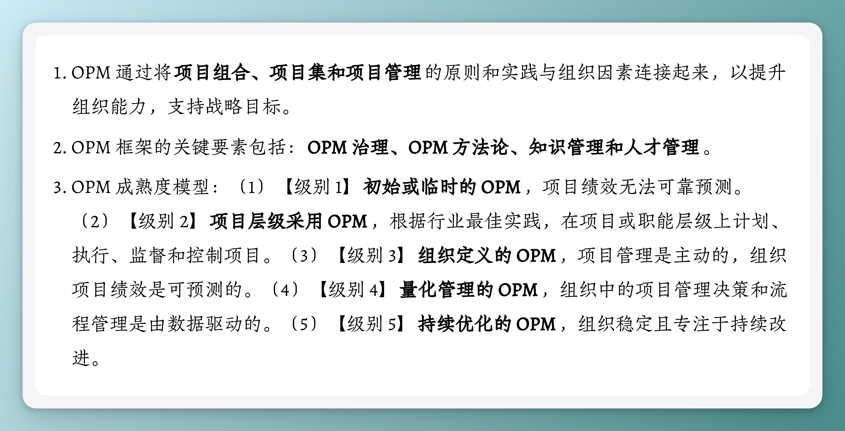 - OPM 通过将项目组合、项目集和项目管理的原则和实践与组织因素连接起来,以提升组织能力,支持战略目标。