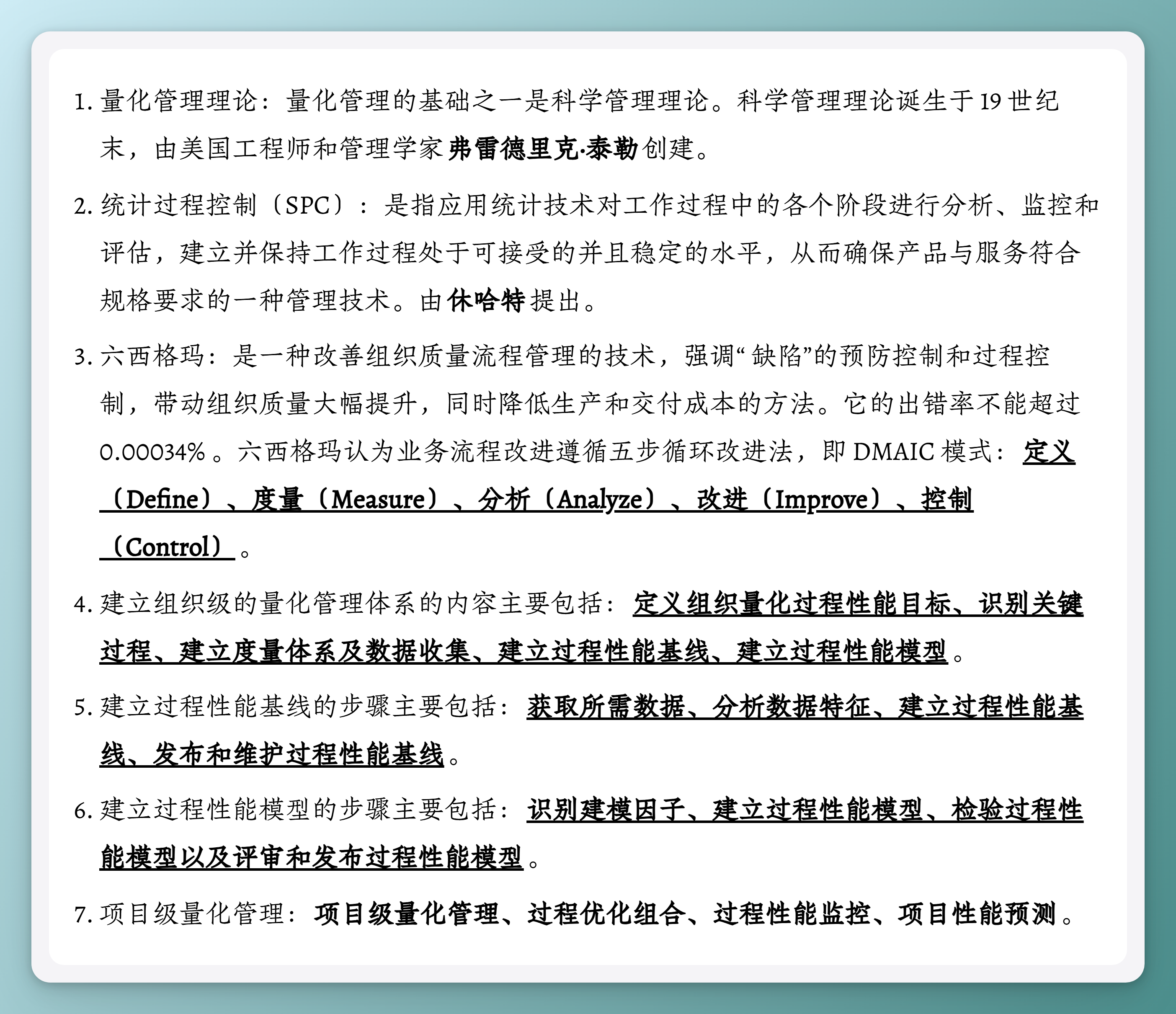7. 项目级量化管理:项目级量化管理、过程优化组合、过程性能监控、项目性能预测