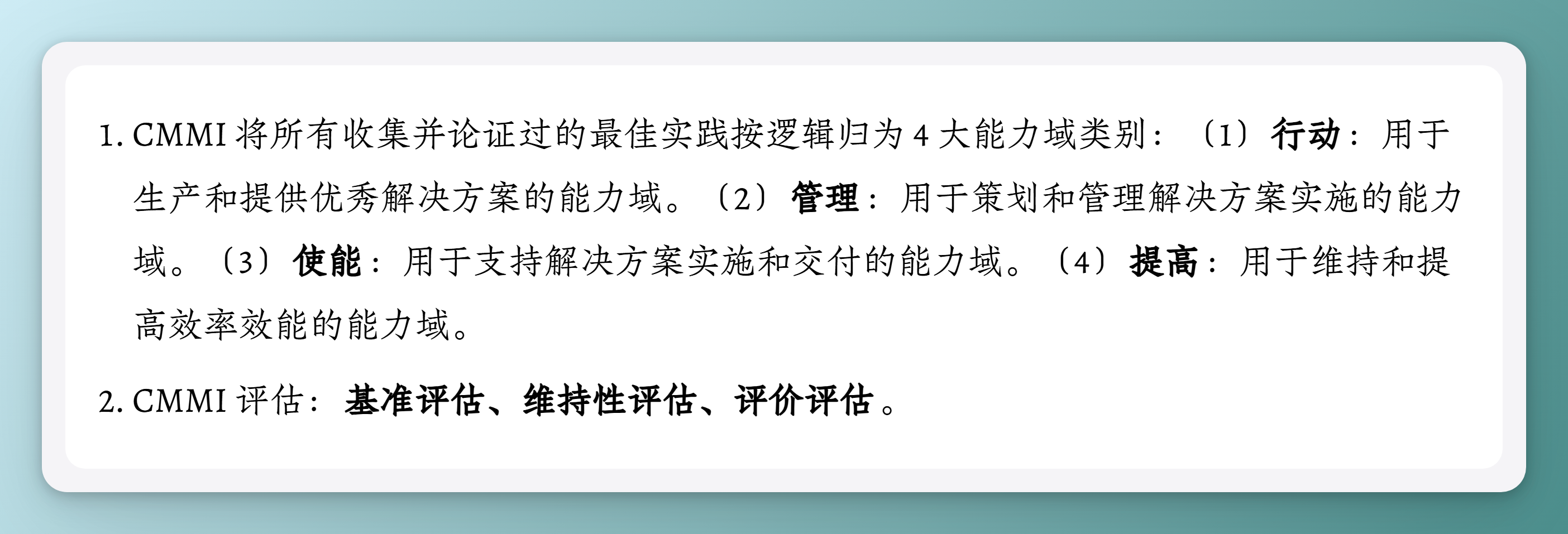 CMMI 将所有收集并论证过的最佳实践按逻辑归为 4 大能力域类别:(1)