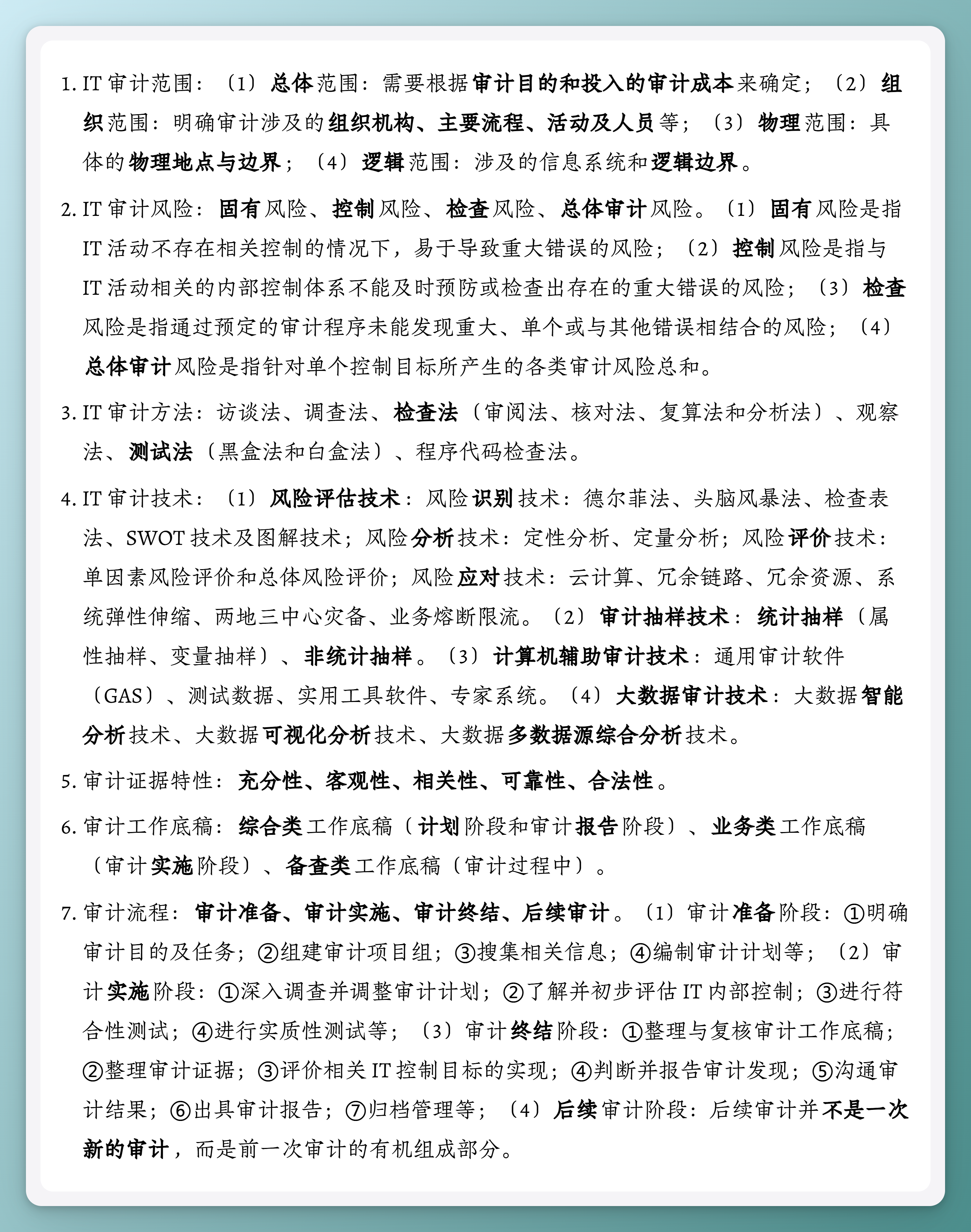 7. 审计流程:审计准备、审计实施、审计终结、后续审计。(1)审计准备阶段:①明确审计目的及任务;②组建审计项目组;③搜集相关信息;④编制审计计划等;(2)审计实施阶段:①深入调查并调整审计计划;②了解并初步评估 IT 内部控制;③进行符合性测试;④进行实质性测试等;(3)审计终结阶段:①整理与复核审计工作底稿;②整理审计证据;③评价相关 IT 控制目标的实现;④判断并报告审计发现;⑤沟通审计结果;⑥出具审计报告;⑦归档管理等;(4)后续审计阶段:后续审计并不是一次新的审计,而是前一次审计的有机组成部分。