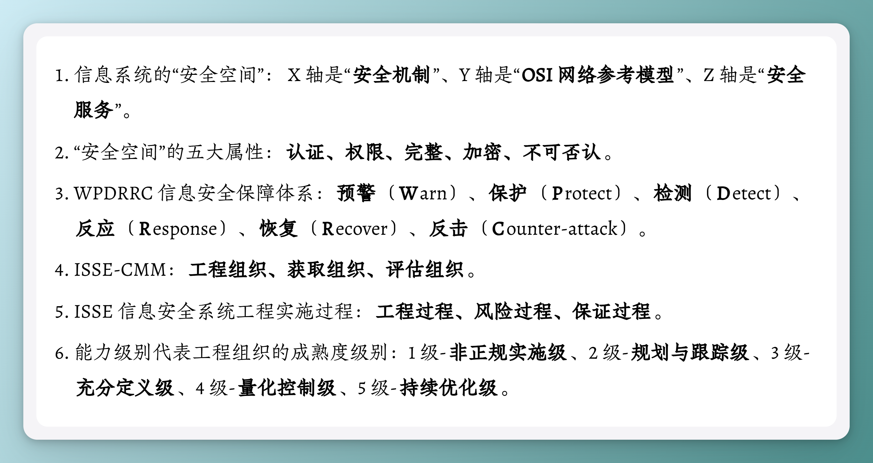 - 智慧城市:(1)五个核心能力要素:数据治理、数字孪生、边际决策、多元融合、态势感知。(2)全生命周期管理:规划设计、部署实施、运营管理、评估改进、创新发展。(3)五位一体高质量发展:城市治理、民生服务、生态宜居、产业经济、精神文明。(4)智慧城市发展成熟度等级:规划级、管理级、协同级、优化级、引领级。