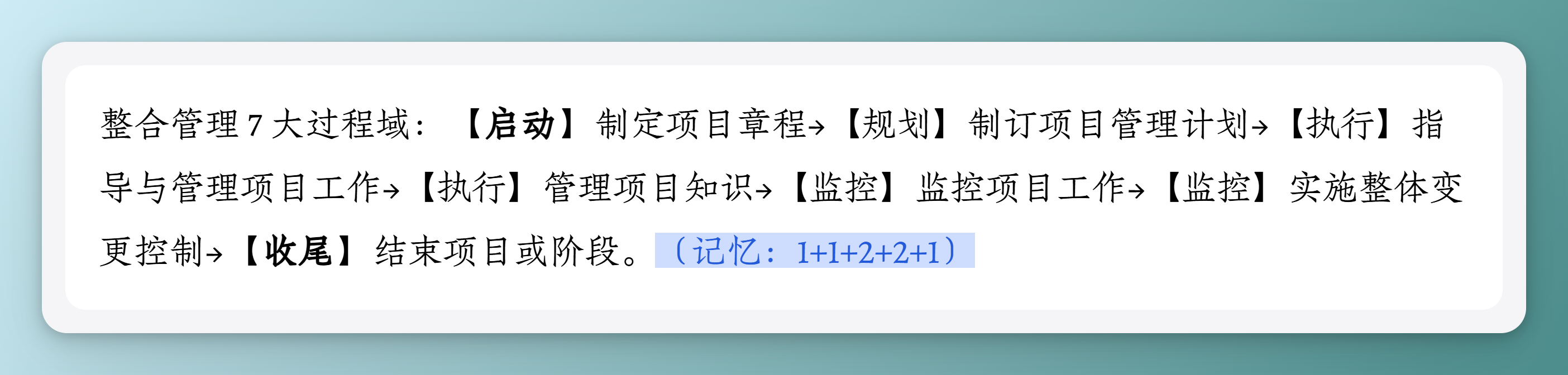 整合管理 7 大过程域:【启动】制定项目章程→【规划】制订项目管理计划→【执行】指导与管理项目工作→【执行】管理项目知识→【监控】监控项 目工作→【监控】实施整体变更控制→【收尾】结束项目或阶段。(记忆:1+1+2+2+1)