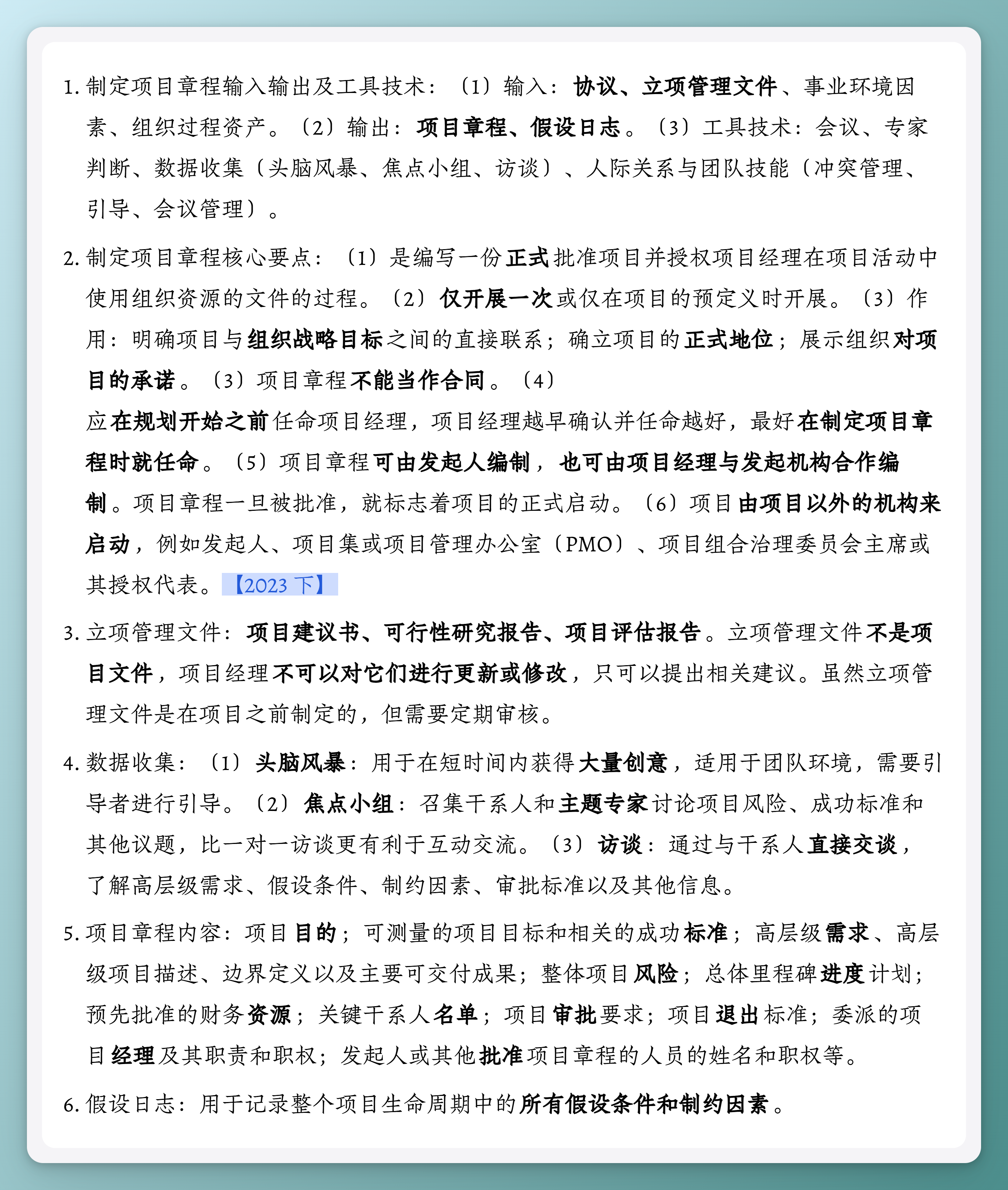 - 制定项目章程核心要点:(1)是编写一份正式批准项目并授权项目经理在项目活动中使用组织资源的文件的过程。(2)仅开展一次或仅在项目的预定义时开展。(3)作用:明确项目与组织战略目标之间的直接联系;确立项目的正式地位;展示组织对项目的承诺。(3)项目章程不能当作合同。(4) 应在规划开始之前任命项目经理,项目经理越早确认并任命越好,最好在制定项目章程时就任命。(5)项目章程可由发起人编制,也可由项目经理与发起机构合作编制。项目章程一旦被批准,就标志着项目的正式启动。(6)项目由项目以外的机构来启动,例如发起人、项目集或项目管理办公室(PMO)、项目组合治理委员会主席或其授权代表。【2023 下】