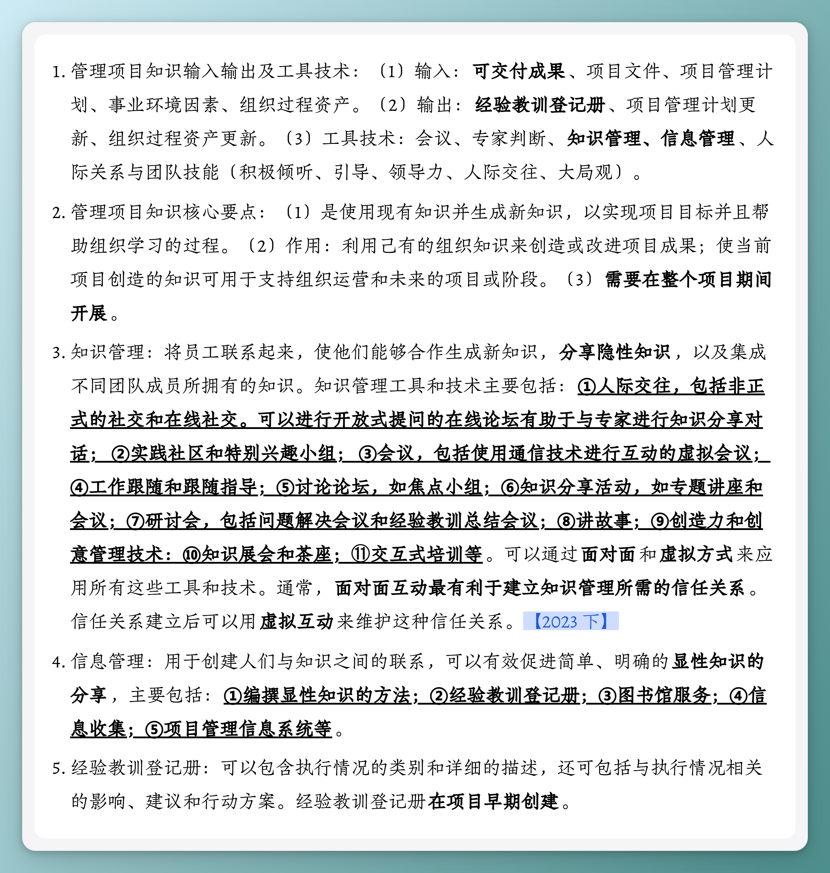 - 管理项目知识输入输出及工具技术:(1)输入:可交付成果、项目文件、项目管理计划、事业环境因素、组织过程资产。(2)输出:经验教训登记册、项目管理计划更新、组织过程资产更新。(3)工具技术:会议、专家判断、知识管理、信息管理、人际关系与团队技能(积极倾听、引导、领导力、人际交往、大局观)。