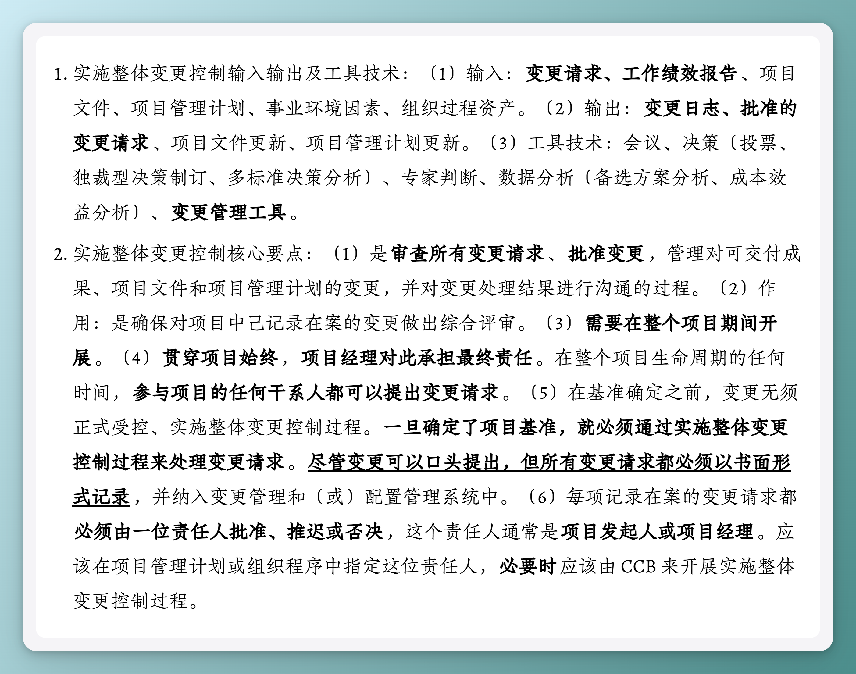 - 实施整体变更控制核心要点:(1)是审查所有变更请求、批准变更,管理对可交付成果、项目文件和项目管理计划的变更,并对变更处理结果进行沟通的过程。(2)作用:是确保对项目中己记录在案的变更做出综合评审。(3)需要在整个项目期间开展。(4)贯穿项目始终,项目经理对此承担最终责任。在整个项目生命周期的任何时间,参与项目的任何干系人都可以提出变更请求。(5)在基准确定之前,变更无须正式受控、实施整体变更控制过程。一旦确定了项目基准,就必须通过实施整体变更控制过程来处理变更请求。尽管变更可以口头提出,但所有变更请求都必须以书面形式记录,并纳入变更管理和(或)配置管理系统中。(6)每项记录在案的变更请求都必须由一位责任人批准、推迟或否决,这个责任人通常是项目发起人或项目经理。应该在项目管理计划或组织程序中指定这位责任人,必要时应该由 CCB 来开展实施整体变更控制过程。