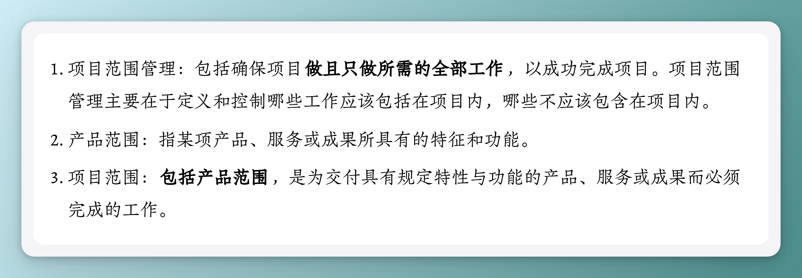 项目范围管理:包括确保项目做且只做所需的全部工作,以成功完成项目。项目范围管理主要在于定义和控制哪些工作应该包括在项目内,哪些不应该包含在项目内。
