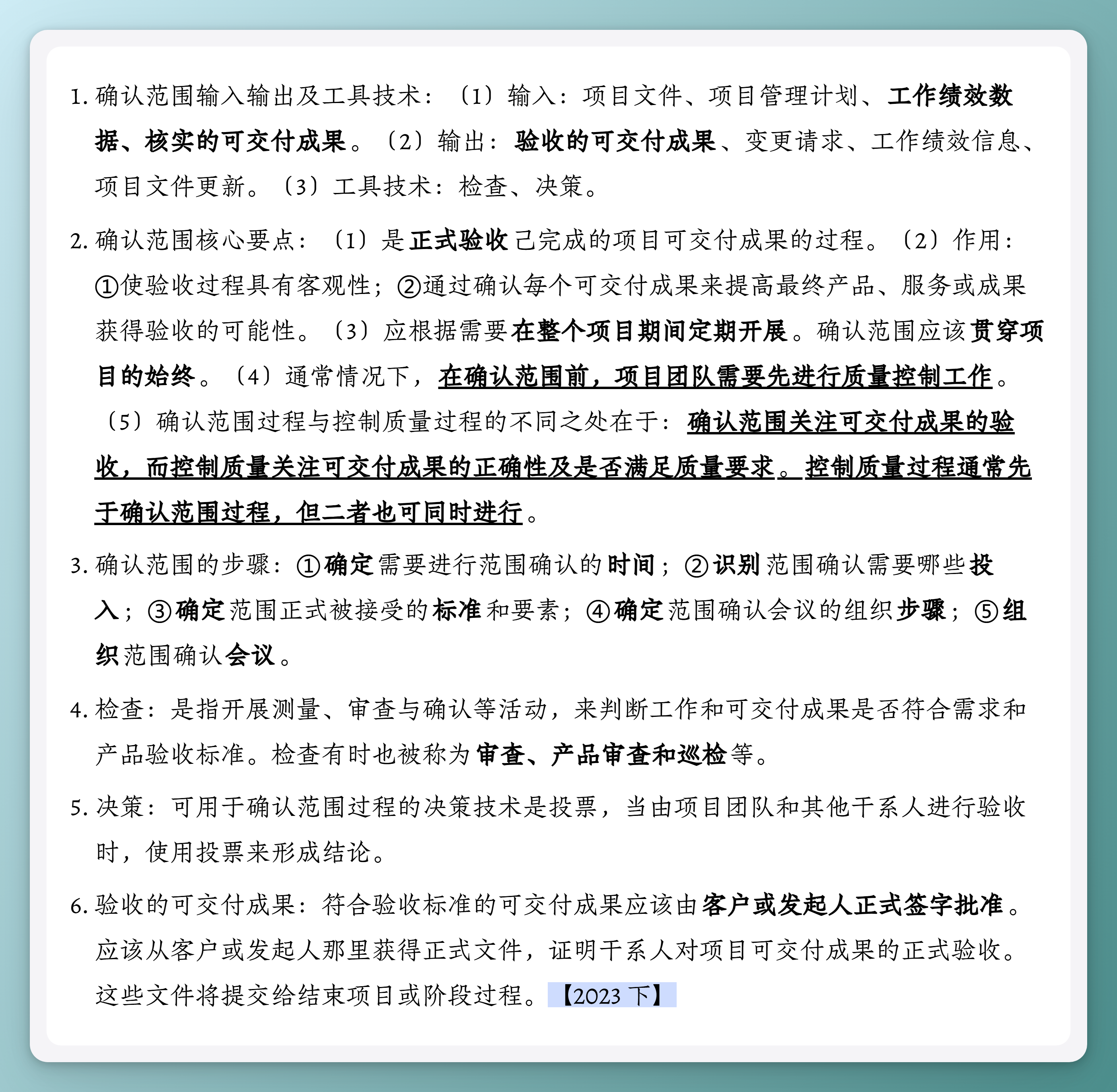 - 确认范围核心要点:(1)是正式验收己完成的项目可交付成果的过程。(2)作用:①使验收过程具有客观性;②通过确认每个可交付成果来提高最终产品、服务或成果获得验收的可能性。(3)应根据需要在整个项目期间定期开展。确认范围应该贯穿项目的始终。(4)通常情况下,在确认范围前,项目团队需要先进行质量控制工作。(5)确认范围过程与控制质量过程的不同之处在于:确认范围关注可交付成果的验收,而控制质量关注可交付成果的正确性及是否满足质量要求。控制质量过程通常先于确认范围过程,但二者也可同时进行。