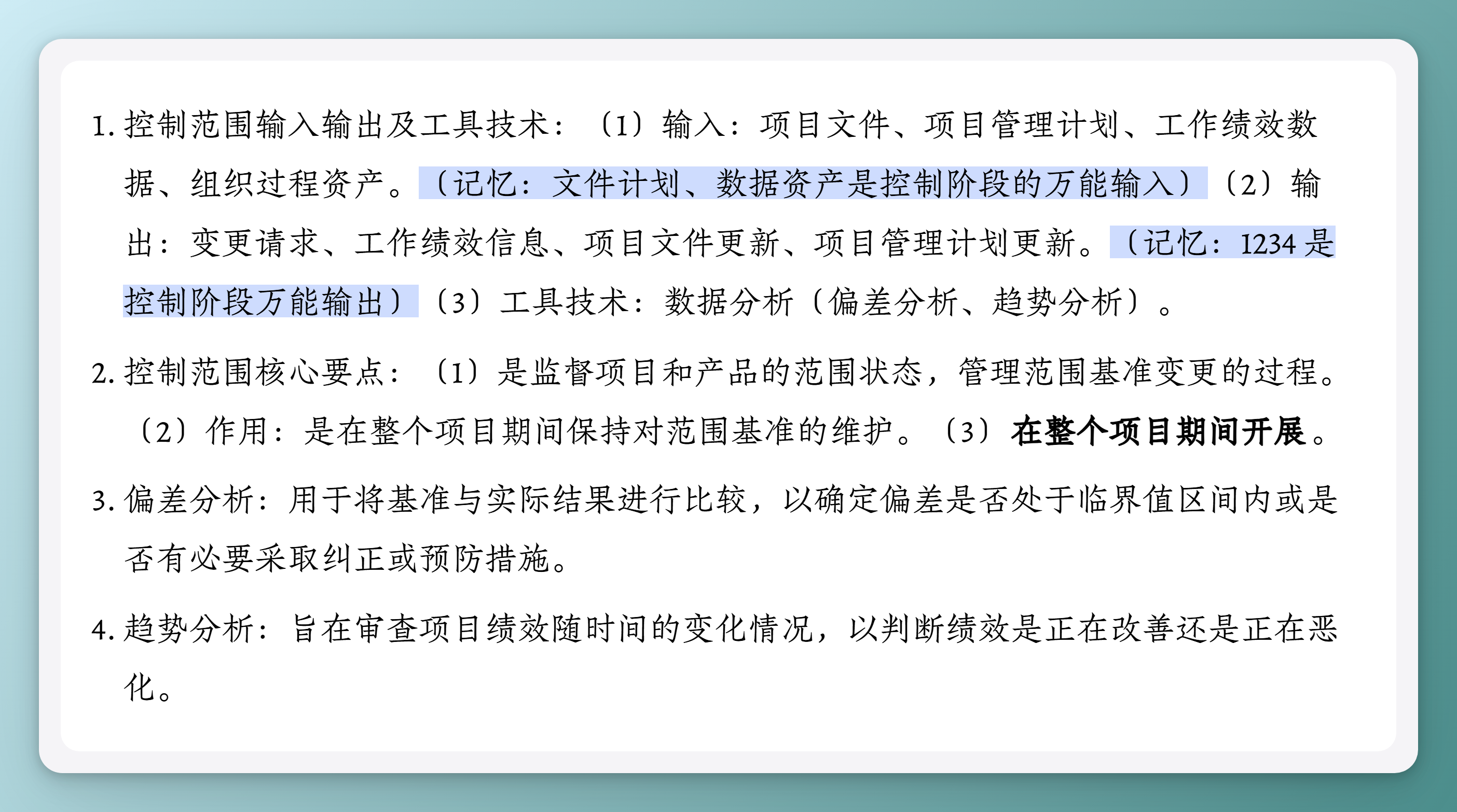 - 控制范围输入输出及工具技术:(1)输入:项目文件、项目管理计划、工作绩效数据、组织过程资产。(记忆:文件计划、数据资产是控制阶段的万能输入)(2)输出:变更请求、工作绩效信息、项目文件更新、项目管理计划更新。(记忆:1234 是控制阶段万能输出)(3)工具技术:数据分析(偏差分析、趋势分析)。